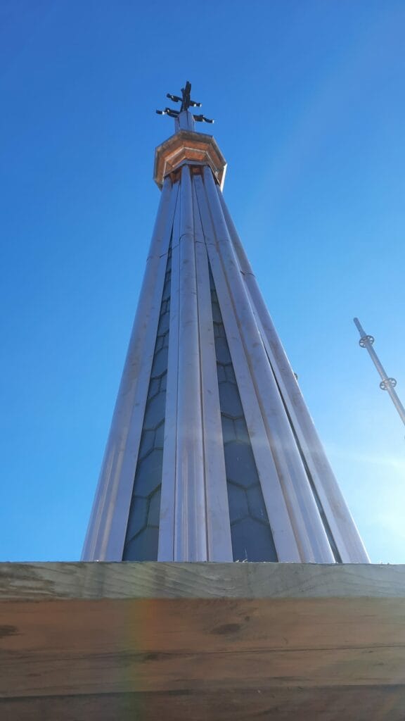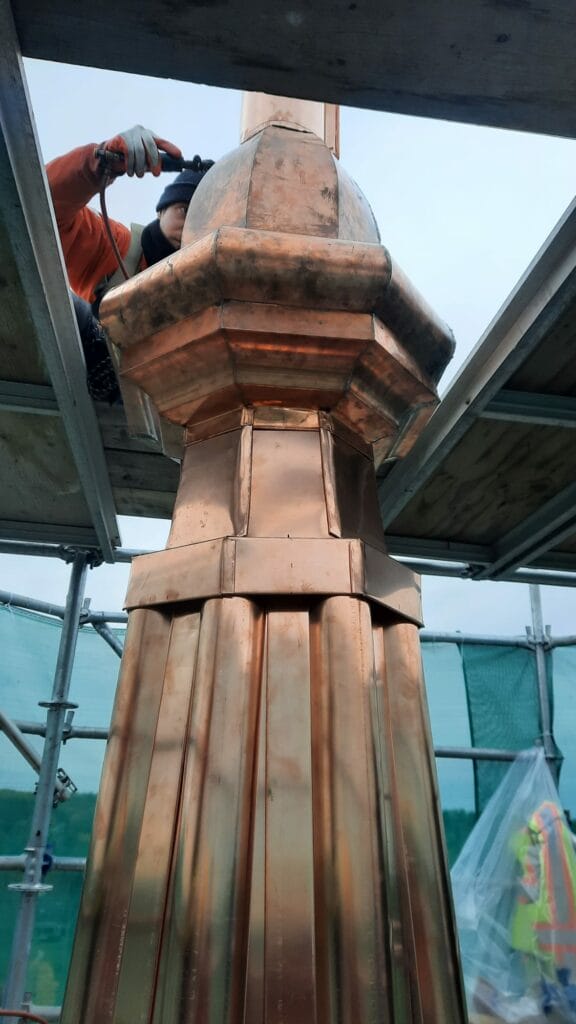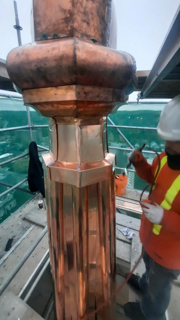 - Copper work for the weathervane/lightning arrestor has been installed and copper flashings installed for the section of the spire above the green safety meshing.